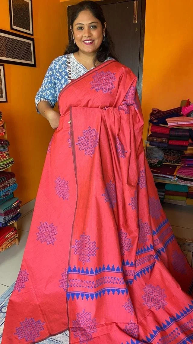 Kolam Block Print Red Saree 01-04-01-PCS-03