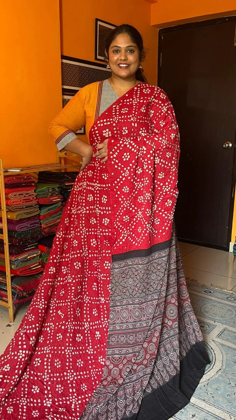 Ajrakh Cotton Saree 46-02-AC-12 Red