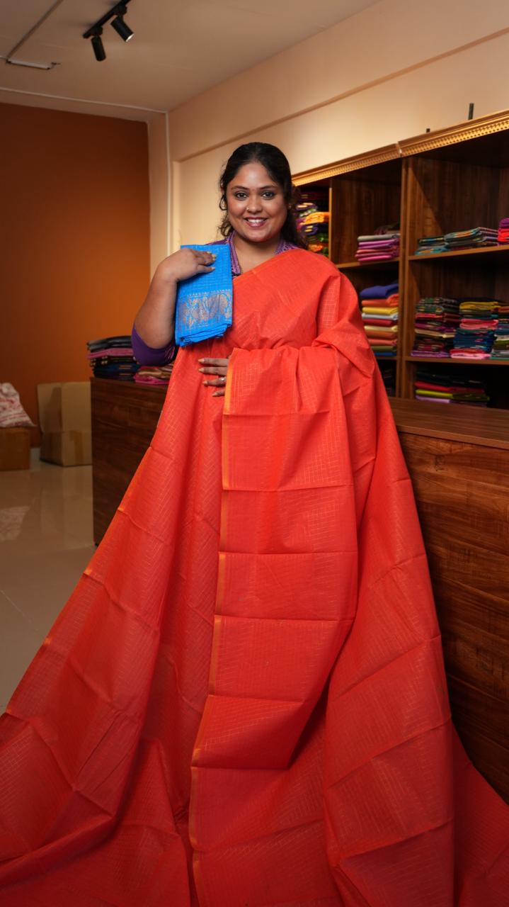 A madurai cotton saree in reddish orange with small borders in gold and zari kattams throught the saree, finishing the pallu with same shade of saree and comes with a separate contrast blouse.