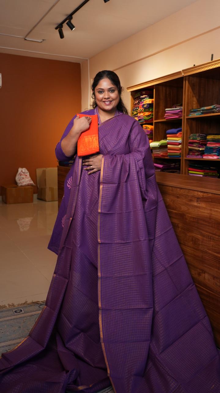 A madurai cotton saree in purple with small borders in gold and zari kattams throught the saree, finishing the pallu with same shade of saree and comes with a separate contrast blouse.