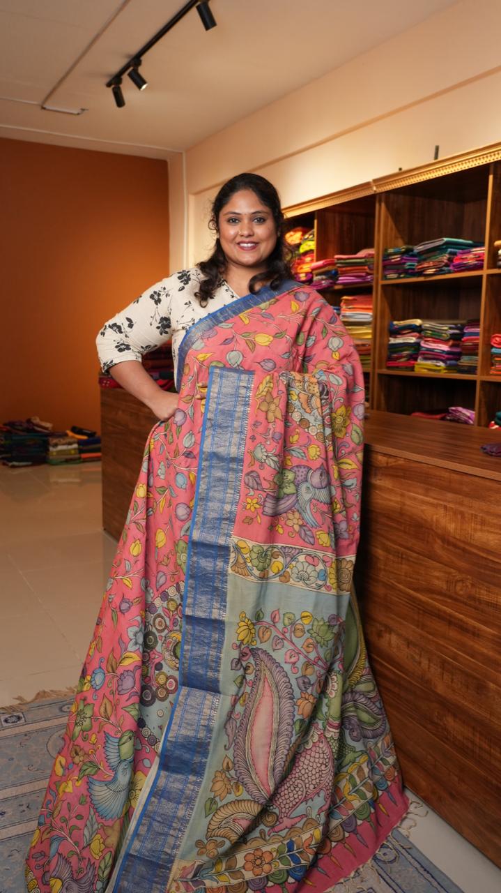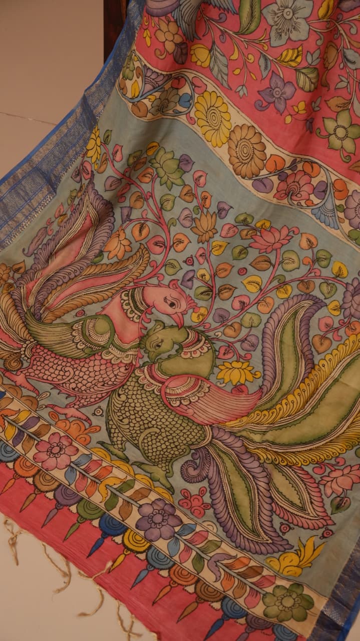 Pen Kalamkari Hand Painted Saree - 02-02-01-07 (CORAL SHORE)